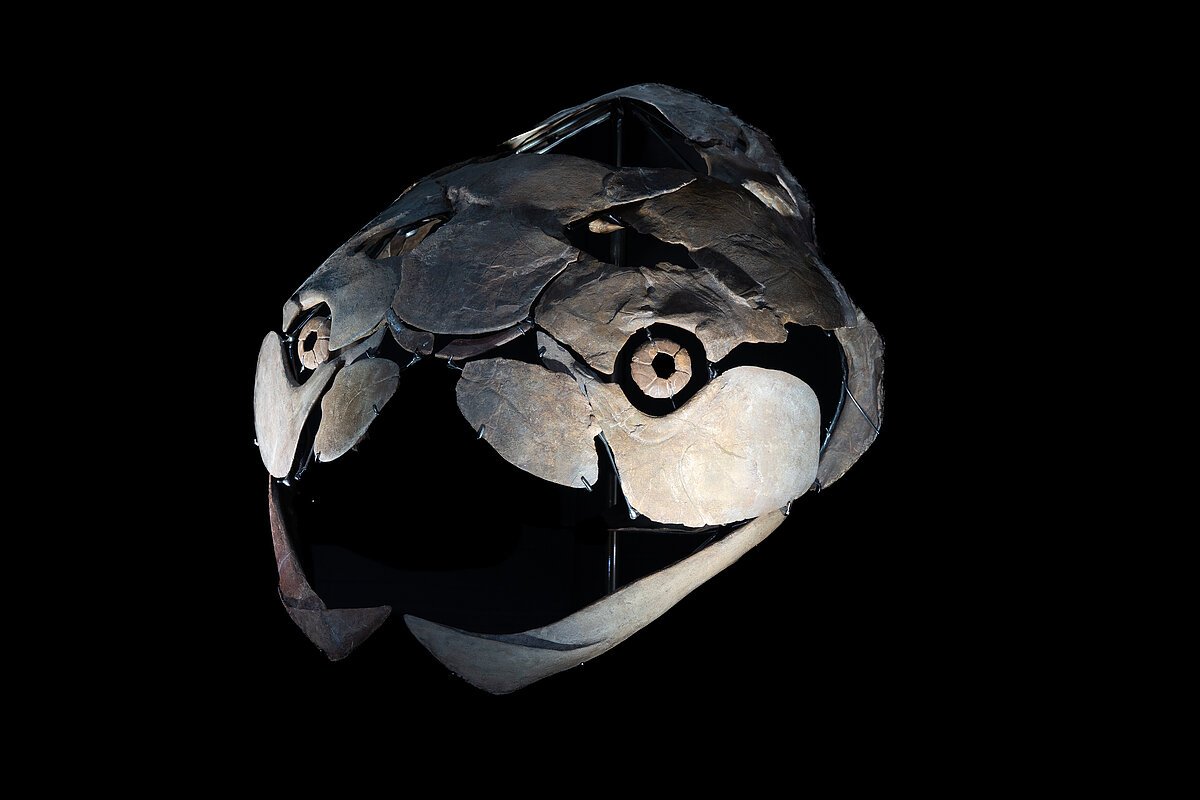 Urzeit-Gigant Titanichthys: Das Dinosaurier Museum Altmühltal zeigt den fossilen Schädel eines Titanichthys, eines gepanzerten Urfischs, der vor etwa 380 Millionen Jahren die Ozeane durchstreifte. Der außergewöhnlich gut erhaltene Fund stammt aus Marokko und zählt zu den wenigen bekannten Exemplaren weltweit. Mit seiner beeindruckenden Länge von über fünf Metern, einem gewaltigen Maul und massiven Knochenplatten gehört Titanichthys zu den größten Vertretern seiner Art und war dennoch, ähnlich wie der Riesenhai oder der Bartenwal, ein Filtrierer. Das heißt, er ernährte sich vermutlich von riesigen Mengen Plankton.