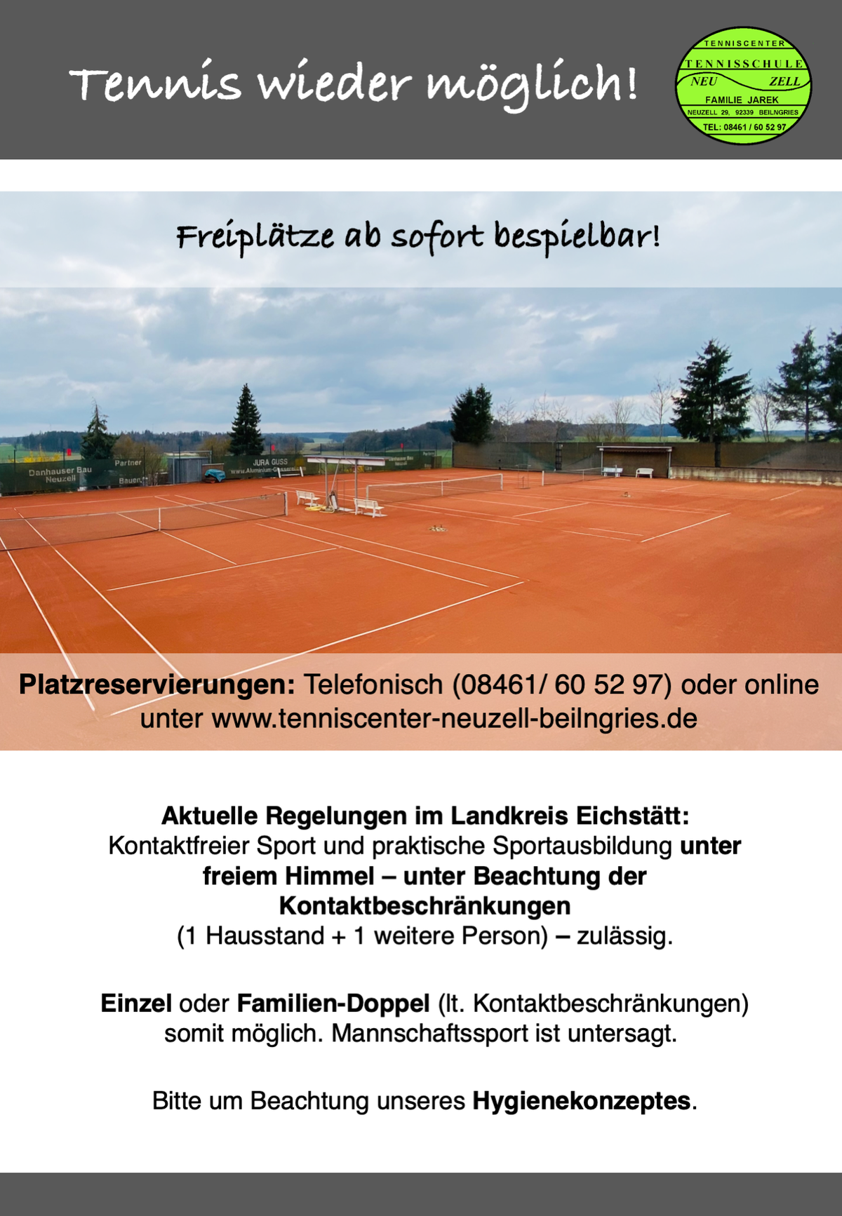 Reservieren Sie die Plätze, stundenweise, telefonisch ( 08461/ 60 52 97 ) oder online unter: www.tenniscenter-neuzell-beilngris.de