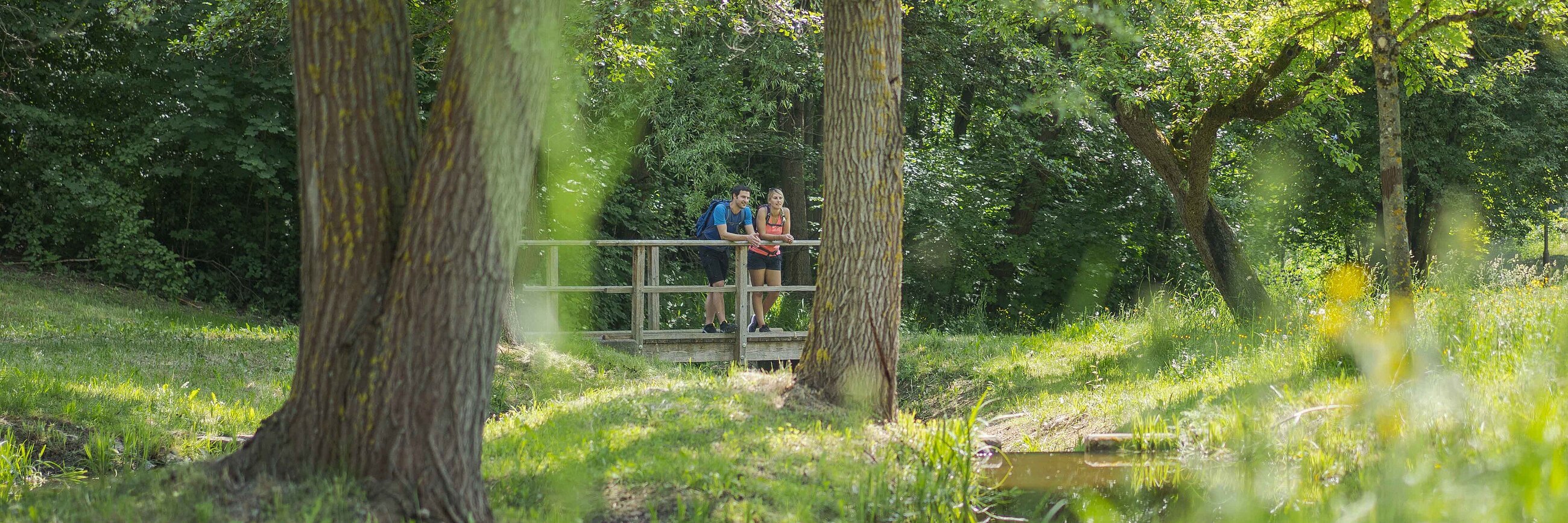 Der in den 90er Jahren angelegte Wasserspielplatz liegt direkt an einem kleinen Bachlauf. Die einfache Vorrichtung mindert den Spielspaß inmitten der Blumenwiese nicht.