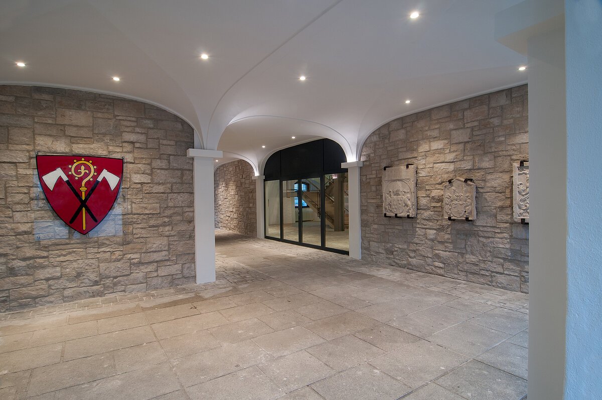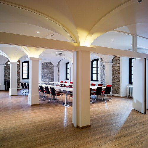 Das Haus bietet im ersten Stock einen wunderschönen Sitzungssaal mit Deckengewölbe und freigelegten Außenmauern. Dieser Saal ist durch eine Wand teilbar, sodass auch zwei kleinere Räume für Arbeitskreise genutzt werden können.