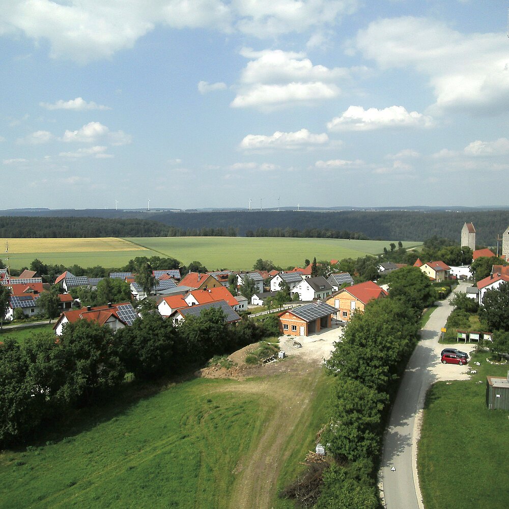 Das Dorf breitet sich westlich einer von Schloss Hirschberg beherrschten Bergzunge, dem Hirschberg, auf dem Hochplateau der Fränkischen Alb aus.