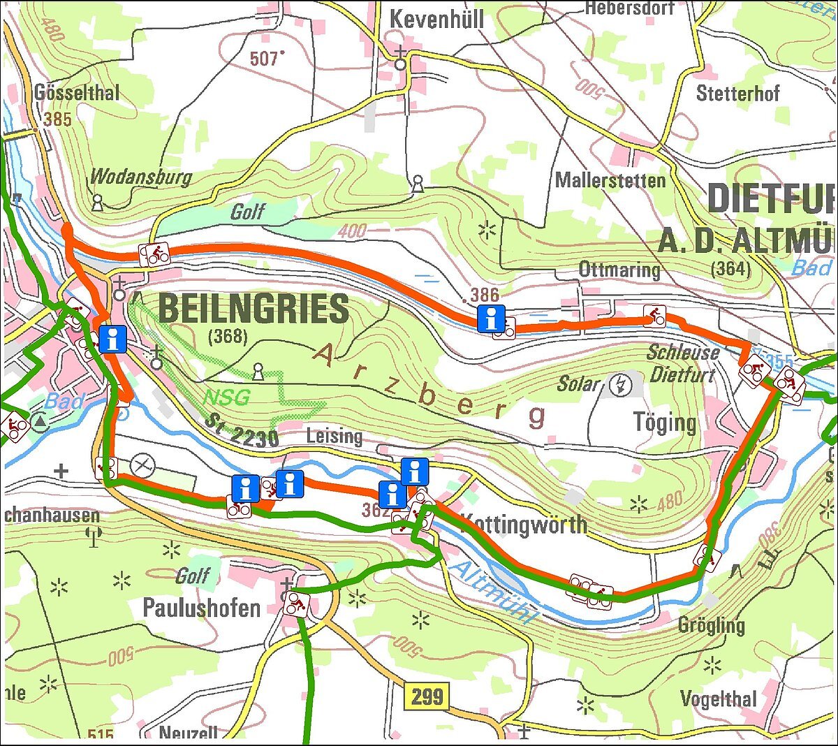 Start: Beilngries Streckenlänge: ca. 18,5 km Info-Stationen: 6 Wegbeschaffenheit: überwiegend befestigte Wirtschaftswege Steigung: nahezu steigungsfrei
