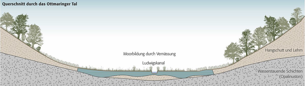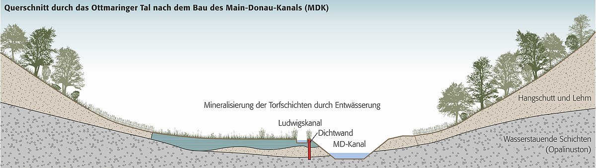 Durch den Bau des Main-Donau-Kanals entstand ein folgenschwerer Verlust für die Tier- und Pflanzenwelt. In den letzten Jahren wurde versucht, den Eingriff in den Lebensraum Ottmaringer Moor zu kompensieren. Die „Spuren“ des Eingriffs als auch der Ersatzmaßnahmen sind im Ottmaringer Tal und im Altmühltal deutlich zu erkennen.