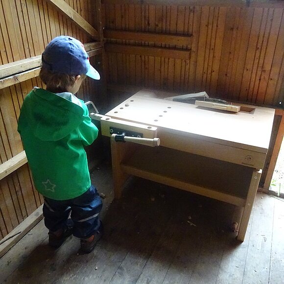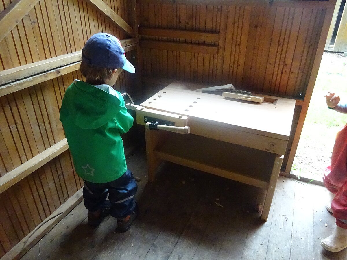 Auf dem Gelände des Naturkindergartens befindet sich eine beheizbare Schutzhütte, außerdem ein Sandkasten, ein Kletterbereich, eine Matschecke, eine Wiesenwichtelkräuterküche, eine Werkstatt, ein Waschplatz und eine Feuerstelle.